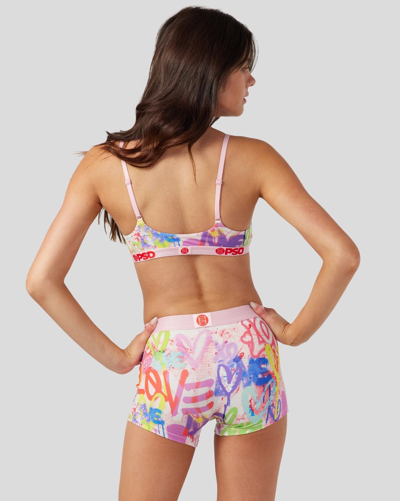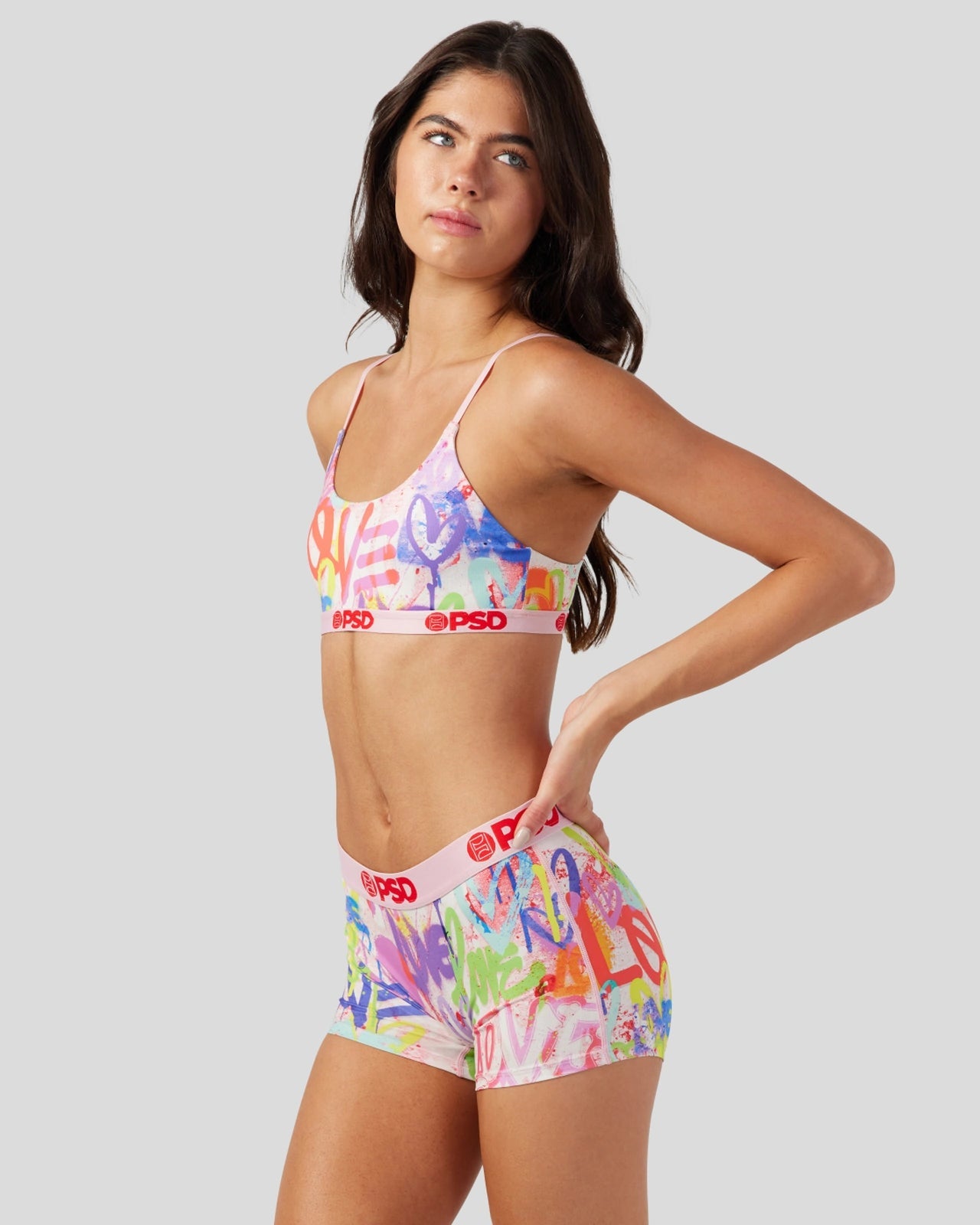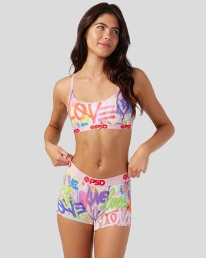 Our newest bralette shows off the softer side of street art with a tagging-inspired print you’ll love. Made of our silky poly blend. the Street Love Scoop Bralette almost feels like you’re not wearing a bra at all. It’s fully lined and features include adjustable straps. a cute scoop neckline. and a soft microfiber band that won’t ride or rub.